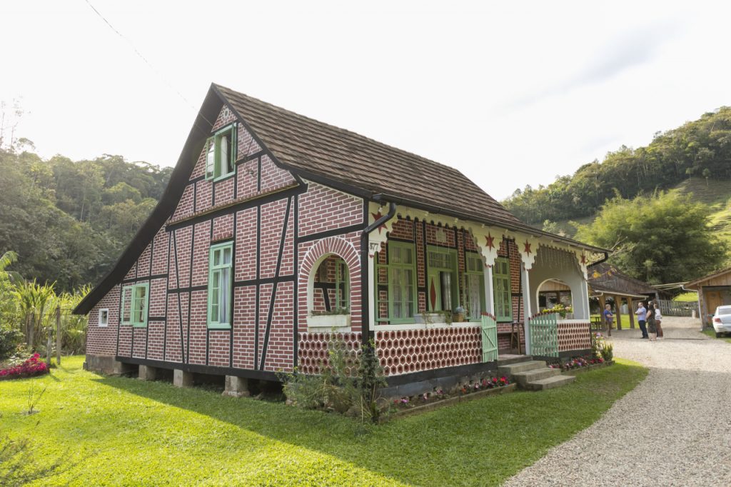 No Sul, os imigrantes pomeranos trouxeram o enxaimel, estrutura de madeira encaixada sem pregos, preenchida com tijolos. As peças eram numeradas com algarismos romanos para permitir desmontagem e remontagem em outro lugar. Uma arquitetura portátil, pensada por povos que ainda não sabiam onde iriam fincar raízes. Pomerode, em Santa Catarina, tem hoje a maior concentração dessas casas fora da Alemanha. A técnica sobreviveu porque fazia sentido: a madeira abundante, o saber transmitido entre gerações, a identidade preservada em cada encaixe.