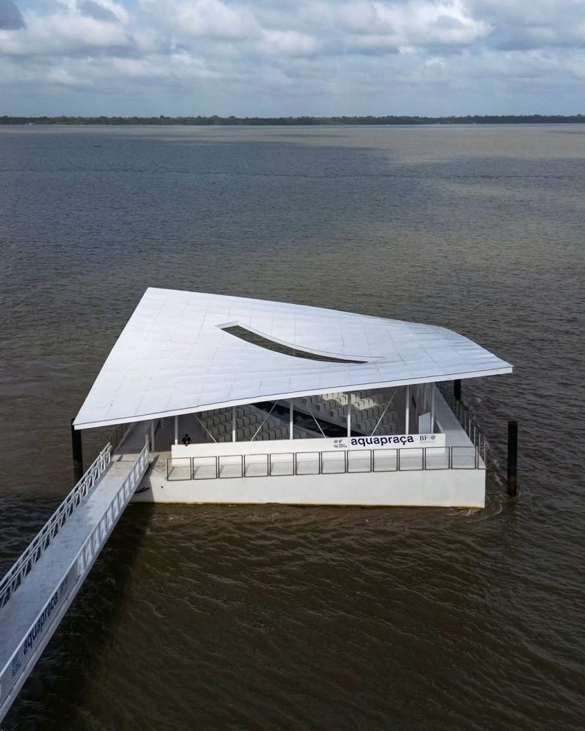Entre as ações e intervenções urbanas, a AquaPraça se tornou um dos símbolos mais fortes do evento. A praça flutuante, concebida inicialmente para a Bienal de Veneza pelos escritórios CRA-Carlo Ratti Associati e a Höweler + Yoon, chegou a Belém com a proposta de dialogar com a água como matéria-prima da própria arquitetura. A estrutura de mais de 400m2, produzida com toneladas de aço marítimo reciclado, é sustentada por tecnologia que regula sua flutuabilidade conforme o nível do rio, transformando a orla da cidade num laboratório vivo de convivência entre engenharia, arte e natureza. Seu impacto demonstrou que a infraestrutura pode ser adaptável e sensível às dinâmicas amazônicas, apontando caminhos para uma arquitetura “anfíbia” que enfrente enchentes, marés e eventos extremos sem impor rigidez ao entorno. O fato de a AquaPraça permanecer após o evento reforça a ideia de que legados climáticos também podem criar novas formas de espaço público.