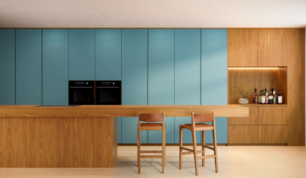 O quarto, por muito tempo tratado como ambiente secundário, ganha protagonismo. O conceito de suíte-refúgio se fortalece: um espaço projetado não apenas para dormir, mas para acolher momentos de leitura e contemplação. Cabeceiras estofadas envolventes, cortinas mais pesadas, iluminação pensada para diferentes momentos do dia. O quarto de 2026 convida a permanecer. Na cozinha, as ilhas ganham formas escultóricas, com curvas e materiais misturados que as aproximam de móveis da sala de estar. O design transicional lidera: nem totalmente contemporâneo, nem declaradamente clássico.